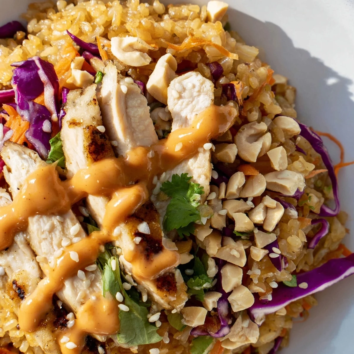 This vibrant Asian-American fusion bowl brings together the satisfying crunch of crispy golden rice with tender marinated chicken breast. Fresh shredded vegetables including romaine, purple cabbage, carrot, and cucumber add refreshing crispness, while the signature Bang Bang sauce delivers creamy, spicy, sweet perfection in every bite.