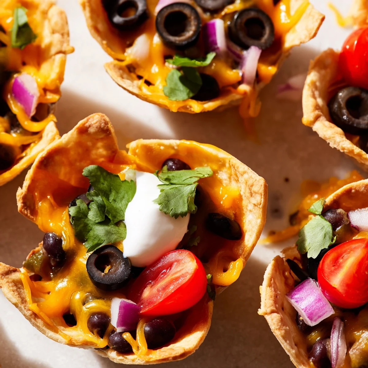 Transform ordinary tortilla chips into irresistible handheld bites with these cheesy nacho cups. Each crispy shell gets piled high with a blend of cheddar and Monterey Jack, then topped with black beans, diced tomatoes, black olives, and red onion. After a quick bake until the cheese turns perfectly melted and bubbly, finish with cool sour cream and fresh cilantro.