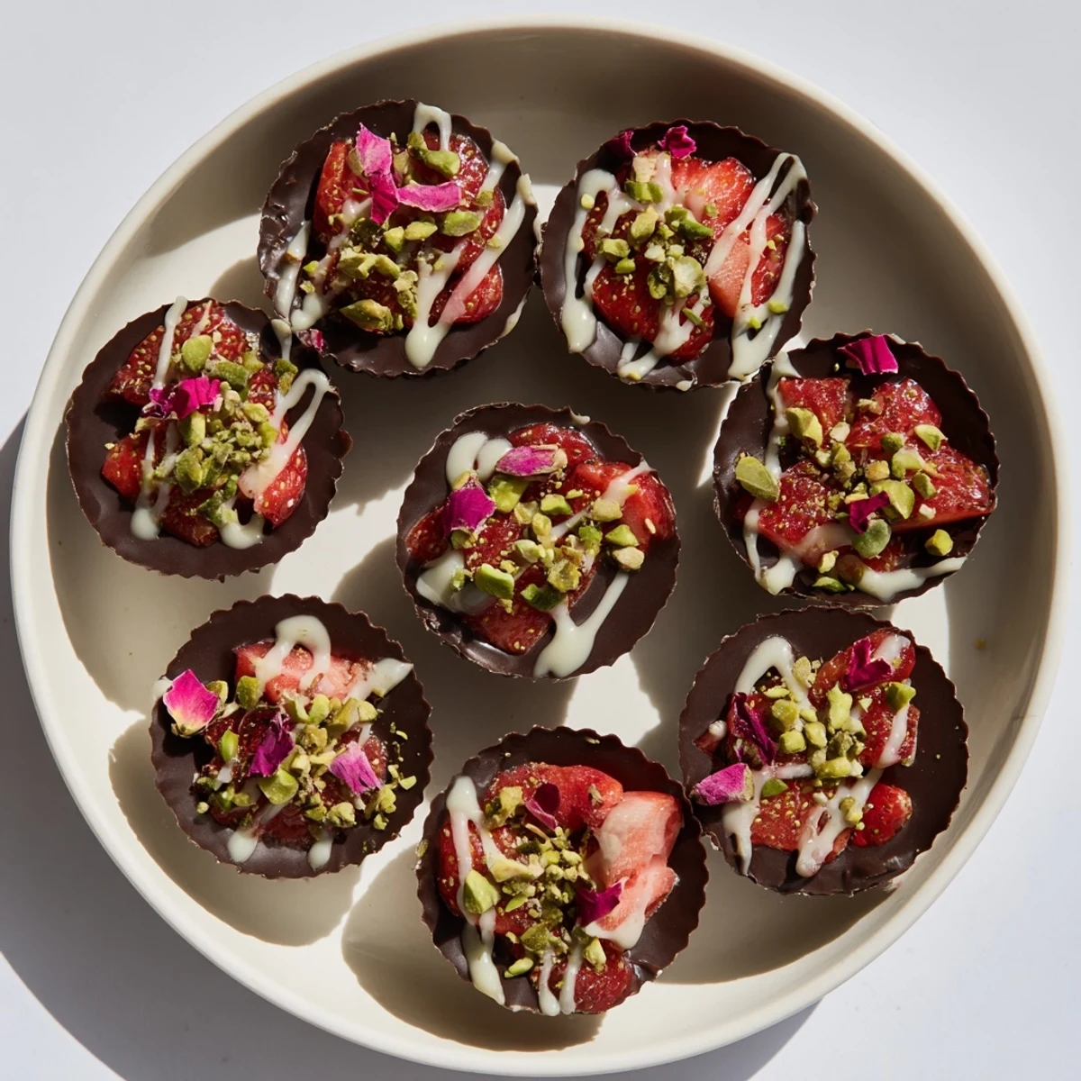 Create these indulgent chocolate cups featuring fresh strawberries enveloped in rich dark chocolate. The strawberries are macerated with honey and aromatic rose water for a Middle Eastern touch, then encased in silky chocolate and finished with chopped pistachios. Perfect for elegant gatherings or as a luxurious treat, these cups combine the natural sweetness of fruit with the sophistication of fine chocolate.