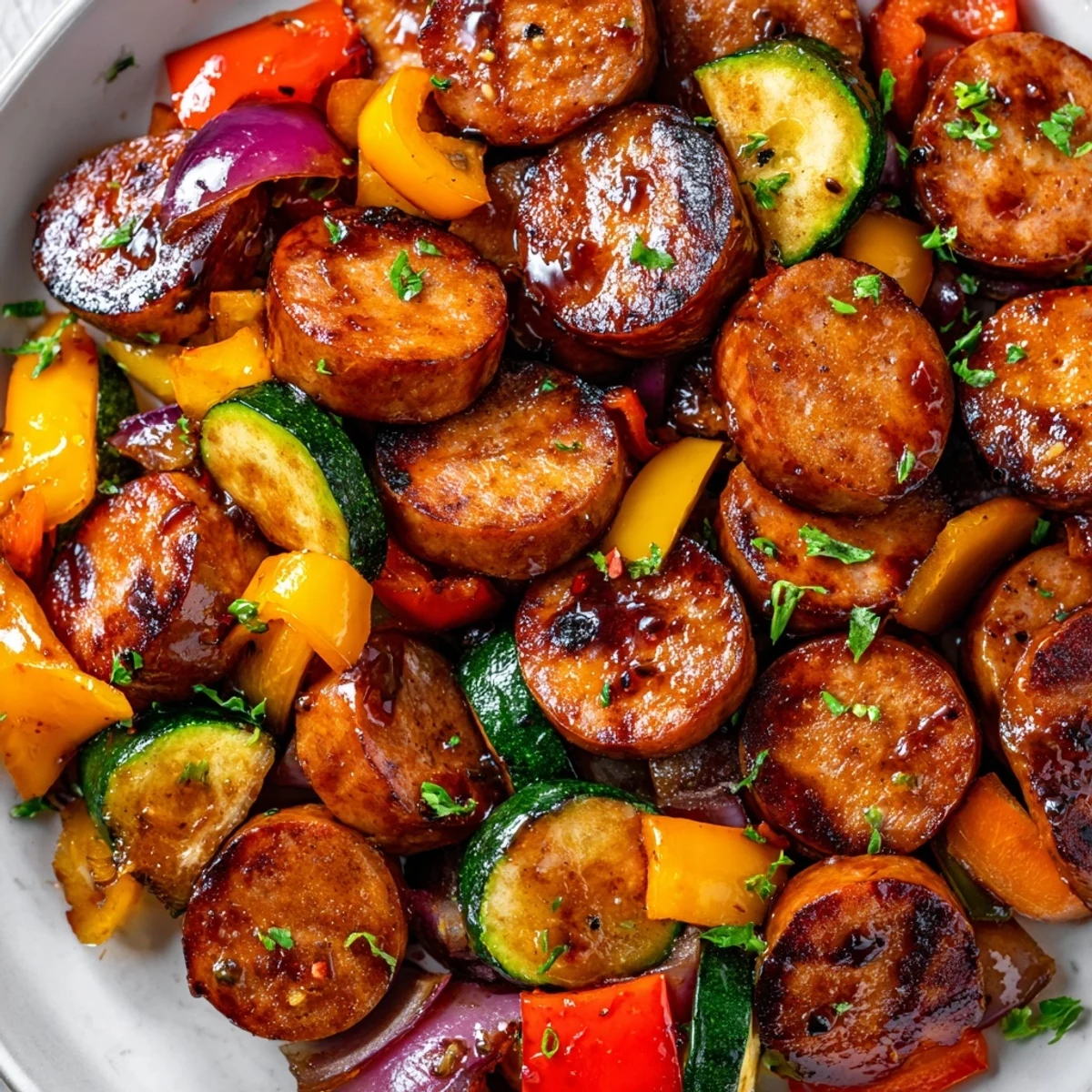 This hearty skillet combines sliced kielbasa with vibrant bell peppers, zucchini, red onion, and baby carrots, all tossed in a sticky honey garlic glaze. The smoky sausage pairs perfectly with the tender-crisp vegetables, while the sauce delivers a balance of sweetness and savory depth.