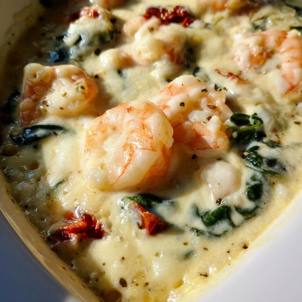 This satisfying Tuscan-inspired bake combines succulent shrimp with a velvety cream sauce infused with sun-dried tomatoes and fresh spinach. The Italian herbs and red pepper flakes add warmth while three cheeses create a rich, bubbly topping. Ready in just 40 minutes, this low-carb dish delivers restaurant-quality flavor with minimal effort—simply sauté the vegetables, simmer the creamy sauce, coat the shrimp, and bake until golden.