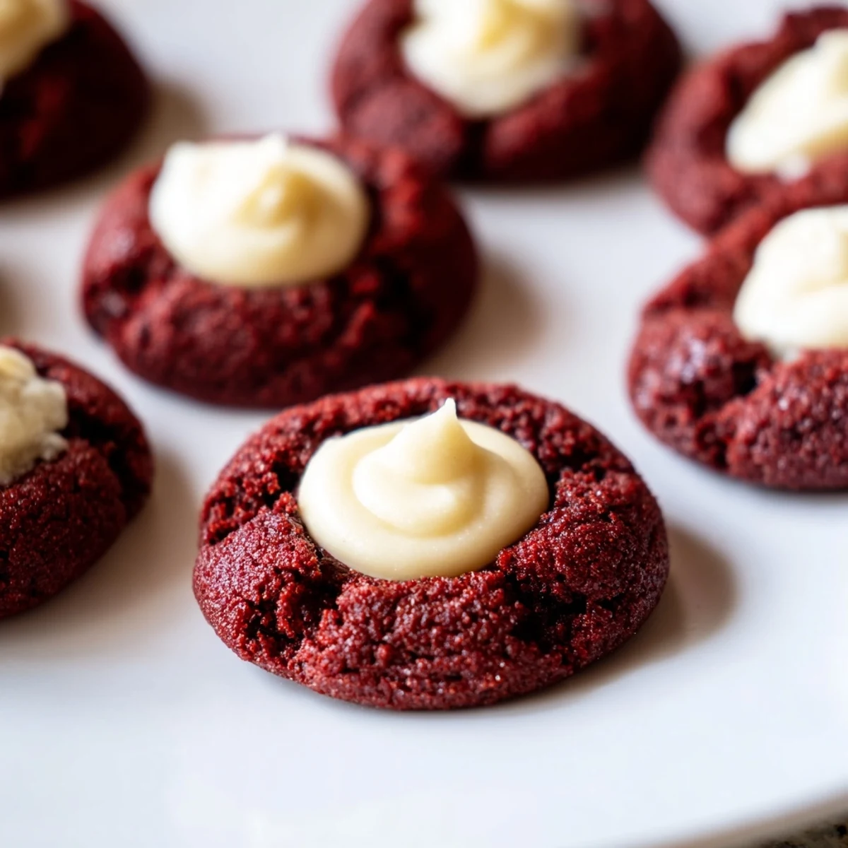 These rich red velvet thumbprint cookies feature a cocoa-enhanced dough with a tender, melt-in-your-mouth texture. Each cookie is hand-pressed and filled with a smooth cream cheese center that creates the perfect balance of tangy sweetness. The striking crimson color makes them ideal for holidays, Valentine's Day, or special occasions. Ready in just over 30 minutes, these elegant treats deliver bakery-quality results with simple ingredients and straightforward technique.